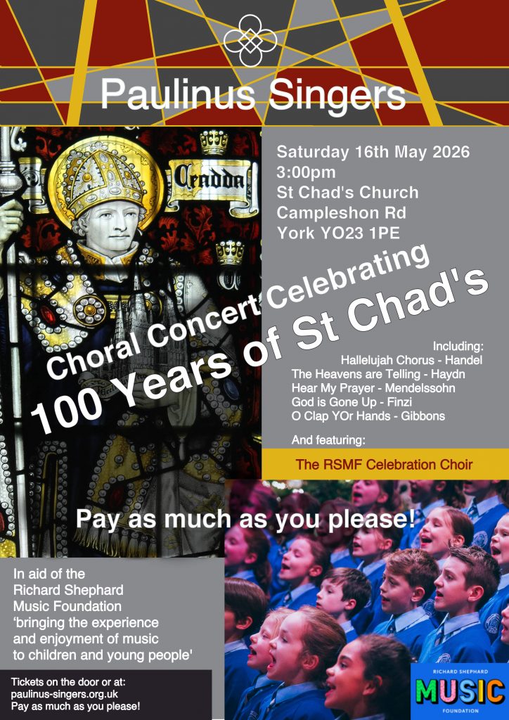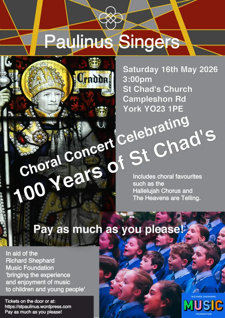 We are delighted to be taking part in the Centenary Celebrations of St Chad's church, on Campleshon Road in York. This is an afternoon concert and we are raising money for the Richard Shephard Music Foundation - an organisation close to our hearts.
